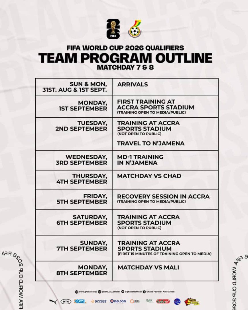 The management committee of Ghana's senior national team, the Black Stars, has announced the team program outline for the upcoming 2026 FIFA World Cup qualifiers against Chad and Mali.