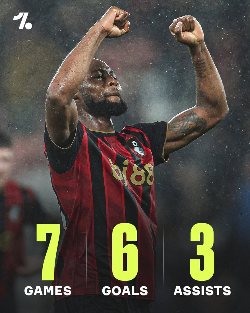 Semenyo began the 2024-25 season by scoring an 86th-minute equalizer in a 1-1 draw with Nottingham Forest on August 17, 2024. Two weeks later, he scored Bournemouth's first goal in a 3-2 comeback win over Everton at Goodison Park.